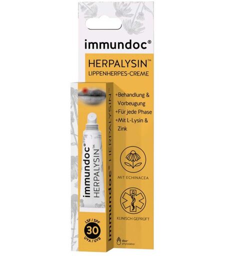Anwendungsgebiet von Immundoc Herpalysin Lippenherpes-cremeimmundoc® Herpalysin® Lippenherpes-Creme ist ein Medizinprodukt zur Vorbeugung und Behandlung von Fieberblasen. Fieberblasen sind eine Infektion der Haut an oder in der Nähe der Lippen, die durch das Herpes-simplex-Virus (HSV-1) verursacht wird.Wirkstoffe / Inhaltsstoffe / ZutatenInhaltsstoffe von Immundoc Herpalysin Lippenherpes-creme:Petrolatum, Ethylhexyl Methoxycinnamate, Octyldodecanol, Aqua, Diethylamino Hydroxybenzoyl Hexyl Benzoate, Octocrylene, Titanium dioxide, Talc, Ethylhexyl stearat, Zinc oxide, Prunus amygdalus dulcis oil, Oleth-10, Isodeceth-6, Echium plantagineum seed oil, Aluminum stearate, Alumina, Simethicone, Bisabolol, Lysine, Sucralose, Phenoxyethanol, Helianthus anuus seed oil unsaponifiables, Cardiospermum halicacabum flower/leaf/ vine extract, Echinacea angustifolia root extract.GegenanzeigenBei bekannter Überempfindlichkeit gegenüber einem der oben genannten Inhaltsstoffe sollte dieses Produkt nicht angewendet werden.DosierungAnwendungsempfehlung von Immundoc Herpalysin Lippenherpes-creme:Für Erwachsene ab 18 Jahren: Tragen Sie die Lippenherpes-Creme mehrmals am Tag (3 bis 6 mal) auf die gesamten Lippen auf.HinweiseGeeignet für Erwachsene ab 18 Jahren.Herpes ist eine ansteckende Infektion. Geben Sie die Creme darum nicht an andere weiter, auch nicht, wenn die Symptome dieselben sind.Außerhalb der Reichweite von kleinen Kindern halten. Am besten bei Zimmertemperatur (5-25 °C) an einem trockenen dunkeln Platz in Originalverpackung aufbewahren.Ausschließlich für die äußere Anwendung auf den Lippen und im Lippenbereich geeignet. Nicht mit den Augen in Berührung bringen.Über Wirkung und mögliche unerwünschte Wirkungen dieses Medizinproduktes informieren Gebrauchsinformation, Arzt oder Apotheker.Lesen Sie vor dem Gebrauch bitte erst die Gebrauchsanweisung.guterratGesundheitsprodukte GmbH & Co. KGEduard-Bodem-Gasse 6A-6020 Innsbruckdoc@guterrat.netImmundoc Herpalysin Li ...