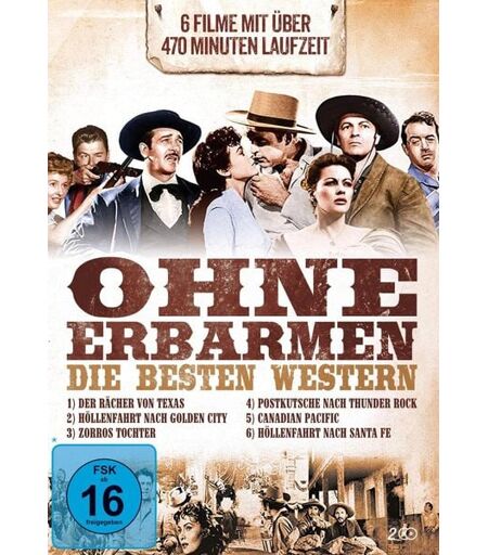 Der Rächer von Texas Während Sheriff Sands in Mexiko weilt, wird sein Bruder auf mysteriöse Weise ermordet. Der Sheriff kehrt nach Texas zurück und stellt den Täter. Höllenfahrt nach Golden City Paul Driscoll und seine Braut sind als Verräter vor Gericht gestellt und erzählen dort, was sie erlebt haben: Driscoll ist auf dem Weg nach Arizona, um das Land, das ihm die Regierung zur Verfügung gestellt hat, in Besitz zu nehmen; daneben will er auch die hübsche Sängerin Mary heiraten, die ihn begleitet. Zorros Tochter Eine spanischblütige Kalifornierin rächt in der Maske Zorros den Verlust der Eltern und des Besitztums an den amerikanisch lizenzierten Unterdrückern und läßt sich mit einem gleichgesinnten Rachekämpfer von einem verständnisvollen Pater trauen. Postkutsche nach Thunder Rock Sheriff Ben Horne ist ein in die Jahre gekommener Gesetzeshüter, deren schwerster Auftrag jedoch nun scheinbar erst auf ihn zukommt. Canadian Pacific Die Rocky Mountains im Jahr 1880. Tom Andrews, ein hartgesottener Mann, ist erster Landvermesser und Aufseher bei der Canadian Pacific Eisenbahn-gesellschaft unter der Führung von Cornelius Van Horne. Höllenfahrt nach Santa Fe Eine gefährliche Postkutschenfahrt steht hier 9 Passagieren bevor, denn Indianerhäuptling Geronimo ist auf dem Kriegspfad. ...