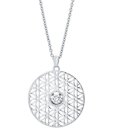 Schöne Julie Julsen Halskette mit rundem Anhänger. In der Mitte tanzt und funkelt ein Zirkonia Stein. Material: Sterling Silber Farbe: silberfarben Steine: Zirkonia Länge: 60 cm Durchmesser Anhänger: 32 mm ...