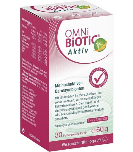 Anwendungsgebiet von OMNi BiOTiC Aktiv - im AlterOMNi BiOTiC Aktiv - im Alter ist ein Nahrungsergänzungsmittel mit speziell ausgewählten, wissenschaftlich erforschten Bakterienstämmen.Wirkungsweise von OMNi BiOTiC Aktiv - im AlterOMNi BiOTiC Aktiv - im Alter enthält elf speziell ausgewählte, wissenschaftlich erforschte Bakterienstämme. Die enthaltenen Bifidobakterien, Laktobazillen und Laktokokken besiedeln den gesamten Darm in hoher Keimzahl: Pro Portion (= 2 g) sind 5 Milliarden natürliche Darmbakterien in OMNi BiOTiC Aktiv - im Alter enthalten.Wirkstoffe / Inhaltsstoffe / ZutatenReisstärke, Maltodextrin, Pflanzenprotein, Kaliumchlorid, Bakterienstämme*, Magnesiumsulfat, Mangansulfat