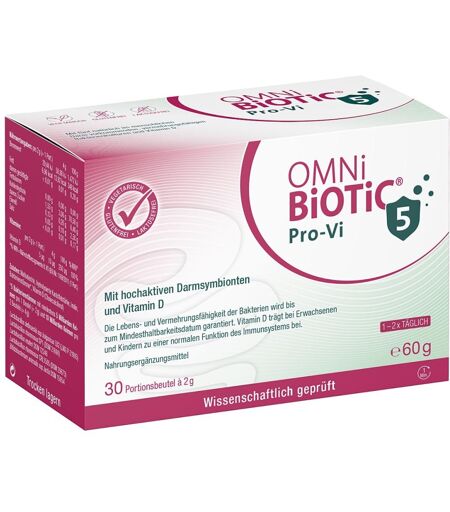 Anwendungsgebiet von OMNi BiOTiC Pro-Vi 5 - Vitamin D für das ImmunsystemOMNi BiOTiC Pro-Vi 5 - Vitamin D für das Immunsystem ist ein Nahrungsergänzungsmittel mit hochaktiven Darmsymbionten und Vitamin D. Vitamin D trägt zu einer normalen Funktion des Immunsystems bei.