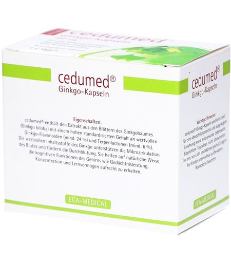 Bitte achten Sie auf eine abwechslungsreiche und ausgewogene Ernährung und gesunde Lebensweise.cedumed® Ginkgo cedumed® enthält den Extrakt aus den Blättern des Ginkgobaumes (Ginkgo biloba) mit einem hohen standardisierten Gehalt an wertvollen Gingko-Flavonoiden (mind. 25 %) und Terpenlactonen (mind. 6 %). Die wertvollen Inhaltsstoffe des Ginkgo unterstützen die Mikrozirkulation des Blutes und fördern die Durchblutung. Sie helfen auf natürliche Weise, die kognitiven Funktionen des Gehirns wie Gedächtnisleistung, Konzentration und lernvermögen aufrecht zu erhalten. Antioxidanzien schützen die zellen vor schädlichen Freien Radikalen.Zutaten: Maisstärke (Füllstoff), Ginkgo biloba Blattextrakt, Hydroxypropylmethylcellulose (Kapselhülle). Nährwertangaben pro 1 Kapsel pro 100 g Brennwert: kJ (kcal) 4,6 (1,1) 1000,5 (240,6) Fett < 0,1 g < 0,1 g davon ges. Fettsäuren 0,0 g 0,0 g Kohlenhydrate 0,2 g 49,0 g davon Zucker < 0,1 g < 0,1 g Eiweiß < 0,1 g 2,9 g Salz 0,0 g 0,0 g Inhaltsstoffe:     Ginkgo biloba Blattextrakt (50:1) 160 mg 35,2 g davon: Ginkgo-Flavonoide (> 24 %) 38,4 mg 8,4 g davon: Terpenlactone (> 6 %) 9,6 mg 2,1 g Frei von Lactose, GMO und Gluten.Verzehrempfehlung:Falls nicht anders verordnet, 1-mal täglich 1 Kapsel unzerkaut nach dem Essen mit ausreichend Flüssigkeit einnehmen. Hinweis:Die empfohlene Tagesdosis nicht überschreiten. Aufbewahrung: Trocken, lichtgeschützt und kühl lagern. Für Kinder unerreichbar aufbewahren. Nettofüllmenge: 90 Kapseln = 37,35 gHerstellerdaten: ECA-MEDICAL HandelsGmbH A-6265 Hart im Zillertal ...
