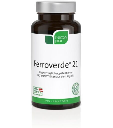 Nahrungsergänzungsmittel sind kein Ersatz für eine abwechslungsreiche und ausgewogene Ernährung und eine gesunde Lebensweise. Jeder Mensch hat einen besonderen Eisenbedarf. Nicht nur Frauen im gebärfähigen Alter, Schwangere und Stillende sollten auf ihren Eisenhaushalt achten. Auch Jugendliche, Sportler, Vegetarier sowie Menschen mit Nahrungsmittelunverträglichkeiten und Darmstörungen sollten ihre Eisenversorgung im Auge behalten. Um gar nicht erst in einen Eisenmangel zu schlittern, ist eine ausgewogene Ernährung das A und O. Unsere Eisenkapseln bestehen aus einem Pilz (A. Oryzae) ohne Verwendung von Zusatzstoffen – dies macht es besonders verträglich! Im Vergleich zum gleichnamigen Eisenpräparat Ferroverde® 14 ist Ferroverde 21 höherdosiert und enthält 21 mg Eisen (Ferroverde® 14 enthält 14 mg Eisen). Das erste Eisen aus rein natürlicher Quelle (aus dem Pilz Aspergillus oryzae) Die natürliche, besonders verträgliche Alternative zu „klassischen“ Eisenpräparaten Mit hoher Bioverfügbarkeit Zur Verbesserung der Eisenversorgung insbesondere bei erhöhtem Eisenbedarf Kombiniert mit Vitamin C aus roter Acerola, das die Eisenaufnahme erhöht Eisen trägt zu Blutbildung, Sauerstofftransport und Energiestoffwechsel, Funktionen des Immunsystems und zur Verringerung von Müdigkeit und Ermüdung beiZutaten: MyccoFerrin®-Komplex (Acerola-Fruchtsaftpulver, Aspergillus oryzae-Pulver), Hydroxypropylmethylcellulose (Kapselhülle), Füllstoff: Cellulosepulver.glutenfrei, laktosefrei, veganInhaltsstoffe:pro Tagesdosis 1 Kapsel% NRV*Eisen21 mg150Vitamin C40 mg50 MyccoFerrin®-Komplex 530 mg - *% der Referenzmenge nach EU Verordnung 1169/2011Verzehrsempfehlung: Täglich 1 Kapsel mit viel Flüssigkeit verzehren. Am besten nüchtern oder 1–2 Stunden nach einer Mahlzeit.Die angegebene empfohlene tägliche Verzehrsmenge darf nicht überschritten werden.Hinweis: Bei Raumtemperatur, trocken und lichtgeschützt lagern. Vor Wärme schützen. Außerhalb der Reichweite von kleinen Kindern aufbewahren. Nettofüllmenge:60 Kapseln = 44 gHersteller:NICApur Supplements GmbH & Co KGA-1070 Wien ...