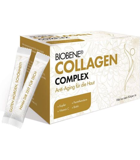 Bitte achten Sie auf eine abwechslungsreiche und ausgewogene Ernährung und gesunde Lebensweise.BIOBENE® Collagen Complex Erleben Sie mit BIOBENE® Collagen Complex die Verjüngung der Haut von innen! Mit biologisch aktiven Kollagenpeptiden, die dort ansetzen, wo herkömmliche Kosmetika nicht hinkommen. Sie reduzieren nachweislich die Faltenbildung. Komplettiert wird der BIOBENE® Collagen Complex mit 7 speziell ausgewählten aktiven Vitalstoffen um Ihrer Haut eine optimale Versorgung für Elastizität und strahlendem Aussehen zu gewährleisten. Erste Ergebnisse sehen Sie bereits nach 4 Wochen täglicher Einnahme. Für strahlend schöne Haut von innen!Folgende positive Wirkungsweisen von Vitamin C, Pantothensäure, Kupfer und Biotin, den weiteren Inhaltsstoffen von BIOBENE® Collagen Complex, wurden von der Europäischen Behörde für Lebensmittelsicherheit in strengen wissenschaftlichen Prüfverfahren bestätigt: Kupfer und Vitamin C tragen dazu bei, die Zellen vor oxidativem Stress zu schützen Kupfer trägt zur Erhaltung von normalem Bindegewebe bei Kupfer trägt zu einer normalen Hautpigmentierung bei Vitamin C trägt zu einer normalen Kollagenbildung für eine normale Funktion der Haut bei Pantothensäure trägt zu einer normalen Synthese und zu einem normalen Stoffwechsel von Steroidhormonen, Vitamin D und einigen Neurotransmittern bei Biotin trägt zur Erhaltung normaler Haut beiZutaten:Kollagen Peptide (64 %), Süßungsmittel: Erythrit, Kokosnusswasser Pulver, Säuerungsmittel: Zitronensäure, Aromen, Bambusextrakt (75 % Kieselsäure), Ascorbinsäure, Süßungsmittel: Steviolglycoside, Calcium D-Pantothenat, Kupfergluconat, D-Biotin.Nährwerte: Durchschnittliche Nährwerte: 1 Stick enthält % Empfohlene Tagesdosis* Collagen Peptide 3000 mg -** Kokoswasser Pulver 500 mg -** Vitamin C 12 mg 15% Pantothensäure 6,0 mg 100% Kupfer 1,0 mg 100% Biotin 50 µg 100% DMAE 100 mg -** * % der Referenzmenge nach Verordnung (EU) Nr. 1169/2011 ** keine AngabeVerzehrempfehlung:1 Stick täglich in Wasser (min. 200ml) gelöst, über einen Zeitraum von mindestens 4 Wochen einnehmen.Hinweis:Die angegebene empfohlene Tagesmenge darf nicht überschritten werden.Aufbewahrung: Kühl (6-25 °C) und lichtgeschützt lagern. Außerhalb der Reichweite von Kindern aufbewahren.Nettofüllmenge: 28 SticksHersteller: Natural Products & Drugs GmbH Neuer Platz 1 A - 9800 Spittal/Drau ...