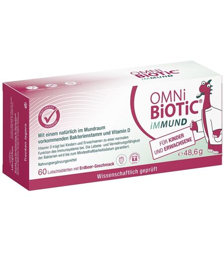 Wirkungsweise von OMNi BiOTiC iMMUND OMNi BiOTiC iMMUND enthält den natürlich im im Mundraum vorkommenden Bakterienstamm Streptococcus salivarius K12 sowie Vitamin D. Dieses Vitamin sorgt bei Kindern und Erwachsenen für eine normale Funktion des Immunsystems.