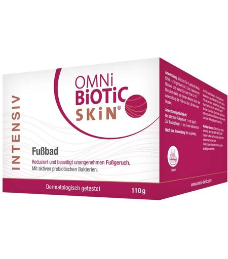 Anwendungsgebiet von OMNi-BiOTiC SKiN Intensiv-FußbadUnsere Füße werden täglich stark beansprucht – enge, schlecht belüftete Schuhe, Feuchtigkeit und Reibung fördern die Ansiedlung von geruchsbildenden Keimen. Die Folge: unangenehmer Fußgeruch, der selbst durch gute Hygiene oft nicht verschwindet.Das OMNi-BiOTiC SKiN Intensiv-Fußbad wurde speziell für Menschen entwickelt, die unter Fußgeruch, Schweißfüßen oder einem gestörten Haut-Mikrobiom leiden.Mit dem innovativen Bakterienkomplex aus lebenden, probiotischen Mikroorganismen bringt das Fußbad die natürliche Hautflora wieder ins Gleichgewicht. Schädliche Bakterien werden verdrängt, die Haut wird sanft gepflegt und unangenehme Gerüche können schon nach 2 Wochen spürbar reduziert oder vollständig beseitigt werden.✔ Mit aktiven, probiotischen Bakterien✔ Für empfindliche, stark beanspruchte Füße✔ 100 % natürliche Inhaltsstoffe – ohne Duft- und Konservierungsstoffe✔ Ideal bei Fußgeruch, schwitzenden Füßen und gestörter HautfloraFür ein frisches Hautgefühl – natürlich & wirksam.Wirkungsweise von OMNi-BiOTiC SKiN Intensiv-FußbadNicht immer hilft häufiges Sockenwechseln oder das Tragen atmungsaktiver Schuhe gegen unangenehmen Fußgeruch. Liegt die Ursache tiefer – nämlich in einer gestörten Hautflora der Füße – reicht äußere Hygiene allein nicht aus. In solchen Fällen braucht die Haut gezielte Unterstützung, um wieder ins Gleichgewicht zu kommen.Das OMNi-BiOTiC SKiN Intensiv-Fußbad bietet genau diese Lösung:Es enthält eine einzigartige Mischung aus 9 lebenden, probiotischen Bakterienstämmen, die sorgfältig ausgewählt und wissenschaftlich untersucht wurden. Gemeinsam mit hochwertigen Präbiotika (Nährstoffe für die guten Bakterien) hilft das Fußbad, das mikrobielle Gleichgewicht der Haut auf natürliche Weise wiederherzustellen.Angereichert mit Kaolin-Ton, Natron und Magnesium pflegt es intensiv und beruhigt selbst strapazierte oder empfindliche Haut – ...
