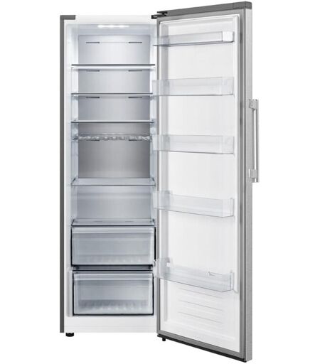 Verbrauchs-EigenschaftenAngabe gem. EU-Verordnung 2019/2016; Energieeffizienzklasse E; Spektrum [A bis G]; 143 kWh/Jahr Energieverbrauch; 0,39 kWh Energieverbrauch in 24 Std.; Energieeffizienzindex: 99; 220-240V 50/60Hz Netzanschluss; LeistungseigenschaftenKlimaklasse SN/T; Kaltlagerzone (ca. 0°C); Metall-Innenrückwand; gesamter Nutzinhalt: 370 l; Nutzinhalt Kühlraum: 370 l; davon Nutzinhalt Kaltlagerzone: 30 l; Superkühlen-Schaltung; Vollraumkühlung; elektronische Temperaturregelung; Geräusch-Schallleistung: 39 dB; Geräuschemissionsklasse C; BedienungTemperaturanzeige außen; Digital-Anzeige; wählbare Kühlteil-Temperatur; opt.+akust. Tür-offen-Warnsignal; Abtauautomatik im Kühlraum und Kaltlager; Kindersicherung; Urlaubsschaltung für Kühlraum; Kühlraum-AusstattungUmluft-Kühlen; LED-Innenraum-Beleuchtung; 4 Sicherheitsglasplatte(n); Anzahl der Gemüseschalen: 1; Flaschenablage; Kaltlagerzonen-AusstattungKaltlagerfächer (ca. 0 °C): 1; transparente Schubfächer; Innentür-Ausstattung5 Türregal(e); ZubehörEiereinsatz; 2 Eiereinsätze; Gehäuse-EigenschaftenBreite: 59,5 cm; Höhe: 185,5 cm; Tiefe: 63 cm; Leergewicht: 62 kg; Anzahl der Türen: 1; Rechts-Anschlag der Tür; Tür-Anschlag wechselbar; höhenverstellbare Gerätefüße; VerpackungsangabenBreite mit Verpackung: 63,4 cm; Höhe mit Verpackung: 195 cm; Tiefe mit Verpackung: 69,5 cm; Gewicht mit Verpackung: 68 kg; Farbenedelstahl; ...