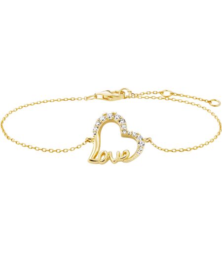 Das zarte Armband begeistert mit einem bezaubernden Herzanhänger, der mit dem Schriftzug „Love“ verziert ist und so Ihre Emotionen stilvoll zum Ausdruck bringt. Die funkelnden Zirkonia-Steine setzen dabei glanzvolle Akzente, die alle Blicke auf sich ziehen. Gefertigt aus hochwertigem Sterling Silber und liebevoll mit einer edlen Vergoldung veredelt, garantiert das Julie Julsen Armband höchste Qualität und Langlebigkeit. Der sichere Karabinerhakenverschluss sorgt für optimalen Halt und Komfort im Alltag. Material: Hochwertiges Sterling Silber mit Vergoldung Steine: Funkelnde Zirkonia Verschluss: Karabinerhaken für optimalen Halt ...