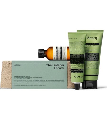 Discover Aesop’s Geranium Leaf collection with The Listener bodycare edit, a holiday exclusive to detoxify, resurface and replenish skin from the neck down. Set Contents: Geranium Leaf Body Cleanser A clear, low-foaming cleansing gel with a soap-free formula that gently lifts dirt from the skin surface and leaves skin purified. Geranium Leaf Body Scrub An exfoliating scrub that resurfaces and smooth uneven skin, allowing a renewed radiance to emerge. Geranium Leaf Body Balm A rich, creamy emulsion that quenches skin with intense hydration from nourishing nut oils. ...