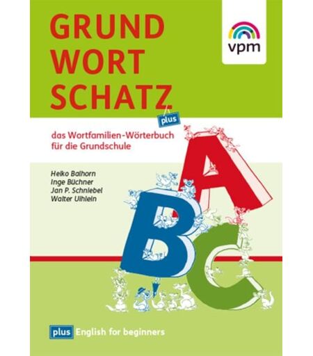 "Grundwortschatz plus – Neubearbeitung! Der Grundwortschatz plus wurde komplett überarbeitet: Er erscheint mit neuem Aussehen und das Wörterbuchverzeichnis wurde aktualisiert. Das Besondere an diesem Wörterbuch ist die Sortierung der Wörter nach ihrem Wortstamm! Indem er betont wird, gliedern sich de Wörter in ""Vorsilbe, Stamm, Fuge und Endung"" - dies erleichtert den Kindern das Verständnis für die Systematik der Wortbildung. Das Wörterbuch ist als Arbeitsbuch konzipiert, denn wenn es um Rechtschreibung geht, muss man schreiben! Die Kinder können im Buch Bemerkungen und Kniffelwörter eintragen sowie die beiliegenden Tiersticker und Teekesselchen-Aufkleber einkleben. Durch das Mitmachen und individuelle Bearbeiten der Seiten wird das Wörterbuch zum individuellen Lernbuch! Zur Einführung in die Arbeit mit dem Wörterbuch gibt es auf den ersten Seiten einen Vorkurs mit 250 Tiernamen. Hier wird mit einfachen Aufgaben die Nachschlagetechnik eingeführt und geübt. plus: English for beginners Der Untertitel ist zugleich Programm: English for beginners ist fast ohne Zutun verständlich. Ausgangspunkt ist– wie immer beim Lernen – bereits Bekanntes: Kinder kennen viele englische Wörter - daraus lässt sich mehr machen. In den Fußnoten finden sich englische Entsprechungen, naheliegende Wörter und Wendungen. Ein grüner Punkt mit einer Zahl heißt: ""Das gibt`s auf Englisch"", jedoch nicht systematisch. Eben so, wie man eine Sprache lernt: bei passender Gelegenheit, sozusagen. " ...