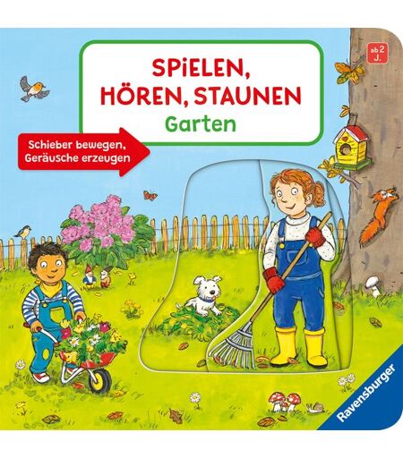 "Was raschelt denn hier? Im Garten kann es laut werden. Knirsch! Die Gartenschaufel gräbt ein tiefes Loch in die Erde. Das Wasser plätschert aus dem Gartenschlauch und raschelnd sammelt der Rechen das Laub ein. In diesem innovativen Sound-Spielbuch können allein durch Bewegung von leichtgängigen Schiebe-Elementen Geräusche selbst erzeugt werden. Wird der Schieber schnell bewegt, klingt das Geräusch anders als bei langsamer Bewegung. Funktioniert ganz ohne Batterien. Die Bücher der ""Spielen, Hören, Staunen""-Reihe sind Soundbücher der besonderen Art: Sie kommen komplett ohne Elektronik oder Batterien aus, da allein durch die Bewegung von Schiebe-Elementen auf den Seiten verschiedenste Geräusche erzeugt werden können. Bereits kleine Kinderhände können die Schieber bewegen. So garantieren diese Bücher unendlichen Geräusche-Spiel-Spaß für Kinder ab 2 Jahren! " ...
