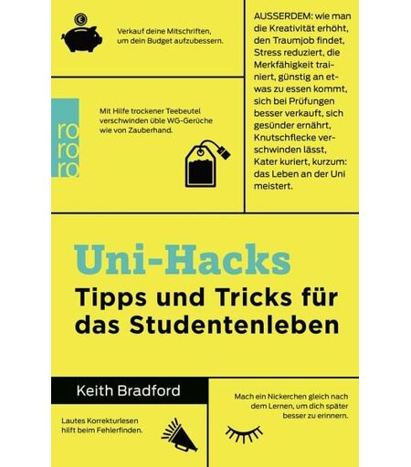 Schokolade macht schlau, schlafen nach dem Lernen fördert das Gedächtnis, und mit Essig und Öl lassen sich Kratzer auf dem Schreibtisch leicht entfernen – Keith Bradford versammelt die lustigsten, nützlichsten und überraschendsten Tipps und Tricks für Studenten. Mit diesem Buch lässt sich das Leben im Wohnheim meistern, bleibt man in Vorlesungen wach, findet den Traumjob, lernt, Stress zu reduzieren, Kreativität zu erhöhen und in Prüfungen geschickt zu schummeln. So macht das Studium Spaß! ...