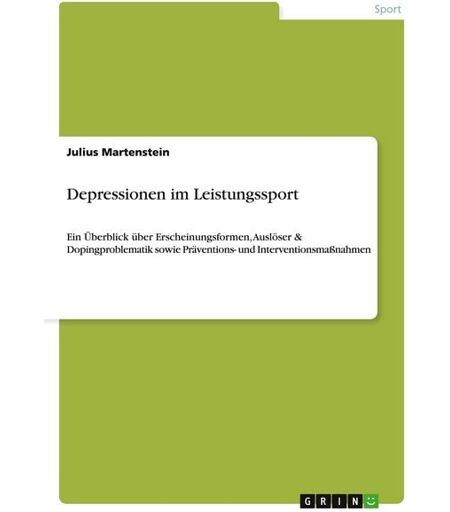 "Dokument aus dem Jahr 2012 im Fachbereich Sport - Sportpsychologie, einseitig bedruckt, Note: 1,0, Philipps-Universität Marburg (Institut für Sportwissenschaft und Motologie), Veranstaltung: Seminar: Emotionen und Geschlecht im Sport, Sprache: Deutsch, Abstract: Depressionen sind in unserer heutigen Gesellschaft ein Thema von enormer Wichtigkeit. So gibt es zahlreiche Studien, welche Auskunft darüber geben, dass Depressionen eine der häufigsten Erkrankungen in Europa sind. In einer Gesellschaft, in der immer mehr Wert auf Leistung gelegt wird, bleiben persönliche Interessen und Bedürfnisse oft uner-füllt. Durch das Nichterfüllen von persönlichen Bedürfnissen und dem Nichterfüllen von Leistungsansprüchen in unserer Gesellschaft geraten immer mehr Menschen in eine persönliche Krise, die Depression: Allein in Deutschland kostete die Behandlung depres-siver Patienten im Jahre 2002 rund 1,6 Milliarden Euro (vgl. Gerstner, 2001, S. 1).Um den immer größer werdenden Anforderungen gerecht zu werden, geraten depressi-ve Menschen in eine Lage, in welcher sie mit allen Mitteln versuchen, ihren Anforderun-gen und den Erwartungen, welche an sie gestellt werden, gerecht zu werden. Oftmals findet diese Kompensation durch illegale pharmakologische Reinsubstanzen, auch Do-pingmittel genannt, statt. So wird ""durch die Verabreichung von Substanzen ... oder durch Anwendung verbotener Methoden"" (Poigné, 2003, S. 5) versucht, den Anforde-rungen gerecht zu werden. " ...