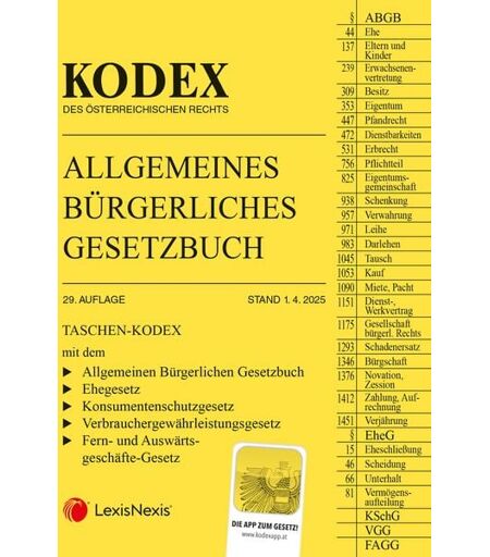 Taschenkodex ABGB , 29. Auflage, Stand 1. 4. 2025 mit dem - Allgemeinen Bürgerlichen Gesetzbuch - Ehegesetz - Konsumentenschutzgesetz - Verbrauchergewährleistungsgesetz - Fern- und Auswärtsgeschäfte-Gesetz ...