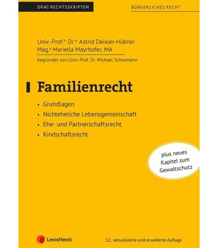 In seiner bereits 12. Auflage ist das von Univ.-Prof. Dr. Michael Schwimann begründete und von Univ.-Prof.in Dr.in Astrid Deixler-Hübner und Mag.a Mariella Mayrhofer fortgeführte Skriptum Familienrecht eine gewohnt topaktuelle und ideale Lernunterlage für einschlägige Studien - und Berufszulassungsprüfungen und eignet sich auch als Informationsquelle für Praktiker:innen . Die übersichtliche und leicht zu erfassende Stoffaufbereitung wird laufend durch Beispiele und besondere Verständnishinweise unterstützt. Als Darstellungsschwerpunkte finden sich in diesem Skriptum: • das Kinder- und Ehegattennamensrecht • alle Formen der Lebensgemeinschaft (Ehe, nichteheliche Gemeinschaft, eingetragene Partnerschaft) • die Ehescheidung und ihre vermögensrechtlichen Folgen • die Aufbereitung des komplizierten Abstammungs- und Obsorgerechts • die familienrechtlichen Auswirkungen des Erwachsenenschutzrechts und neu ein Kapitel zum Gewaltschutz. ...