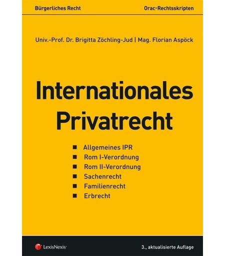 "Orac-Rechtsskriptum ""Zöchling-Jud/Aspöck, Internationales Privatrecht"" 3. Auflage, Stand Juni 2015: Weist ein Sachverhalt eine Beziehung zu einer oder mehreren anderen Rechtsordnungen auf, muss entschieden werden, nach welcher dieser Rechtsordnungen der Sachverhalt zu beurteilen ist. Diese Aufgabe kommt dem Internationalen Privatrecht, dem Kollisionsrecht, zu. Das vorliegende Skriptum bietet Studierenden und Praktikern einen ersten Einstieg in diese Rechtsmaterie. Behandelt werden nach einer allgemeinen Einführung das österreichische IPR-Gesetz , die europäischen Verordnungen sowie alle wichtigen Regelungen in Staatsverträgen . " ...