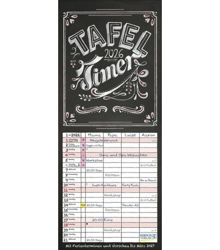 Korsch Familienkalender - Produktmerkmale Übersichtlicher Familienplaner für bis zu 4 Personen; sehr stabile Rückwand ; 19 x 46 cm Terminkalender mit viel Platz für Eintragungen, ohne störende Bilder in den Spalten leichte Beschreibbarkeit , auch mit Bunt- und Bleistiften Mehrsprachiges Kalendarium (d,e,f,i) mit regionalen Feiertagen für Deutschland, Österreich und Schweiz Farblich hervorgehobene Sonn- und Feiertage, sowie Anzeige der Zeitumstellung Gedruckt auf dickem und umweltfreundlichem Korsch Familien - Jahreskalender Dieser Wandkalender hilft Ihnen dabei alle wichtigen Termine stets im Blick zu haben. Mit vier Spalten zum Eintragen von Geburtstagen, Terminen und Erinnerungen bietet dieser Jahreskalender viel Platz für Notizen. Dadurch ist es auch möglich . mehrere Termine in einen Tag zu schreiben. Er eignet sich perfekt für die Organisation des Ehe- oder Familienlebens. Neben dem gesamten Kalenderjahr enthält der Wandplaner auch eine Vorschau bis März des Folgejahres. Weitere Informationen wie Mondphasen , Ferientermine und Feiertage (auch regionale) sowie deutlich lesbare Kalenderwochen runden den Kalender ab und sorgen für einen vollständigen Überblick Ihres Jahres. Chalk-board Art Dieser liebevoll von der Künstlerin Mo Büdinger gestaltete Familienplaner im megatrendigen Tafel-Kreide-Look ist der passende Kalender für Menschen, die das Besondere suchen und Wert auf hochwertige Gestaltung legen. Die Kunst aus Typografie, Handlettering und Kreide einzigartige Bilder in Kreidetafel-Optik im Caféhaus-Stil entstehen zu lassen. Von Hand gezeichnete Kreidestriche und schwungvolle Verzierungen lassen auf dem dunklen Tafelhintergrund Buchstaben und Bilder miteinander zu einem Kunstwerk verschmelzen und setzen jeden Monat gekonnt in Szene. ...