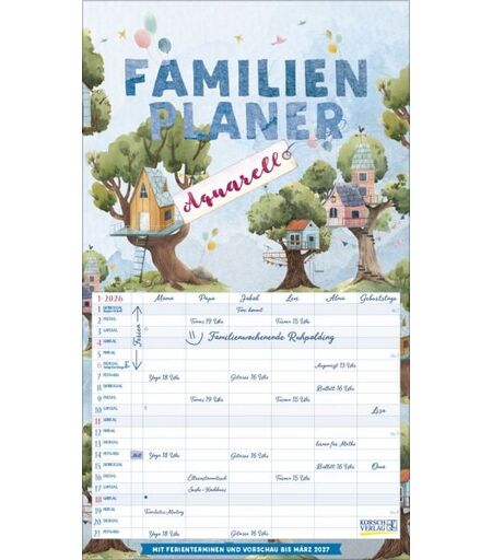 Korsch Familienkalender - Produktmerkmale Übersichtlicher Familienplaner mit 6 großen Spalten; sehr stabile Rückwand ; 27 x 46 cm Terminkalender mit viel Platz für Eintragungen, ohne störende Bilder in den Spalten leichte Beschreibbarkeit , auch mit Bunt- und Bleistiften Deutsches Kalendarium mit regionalen Feiertagen für Deutschland, Österreich und Schweiz Farblich hervorgehobene Sonn- und Feiertage, sowie Anzeige der Zeitumstellung Gedruckt auf dickem und umweltfreundlichem Aquarell-Motive liegen voll im Trend. 12 zarte und zugleich fröhliche Motive machen Monat für Monat gute Laune und bringen Schwung in die tägliche Planung. Ein luftig-leichter Familienplaner mit 6 Spalten, extra Müllspalte sowie Ferienterminen und Vorschau bis März des Folgejahres. ...