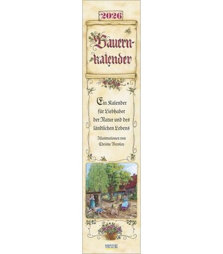 Produktmerkmale • Format: 11 x 48 cm; schmaler Wandkalender mit 12 einzigartigen Bildern • Kalendarium auf Deutsch mit hervorgehobenen Sonn- und Feiertagen für D, A und CH • Gedruckt auf Praktischer Langplaner mit nostalgischen Bildern des ländlichen Lebens von Christa Versley und Bauernregeln. ...