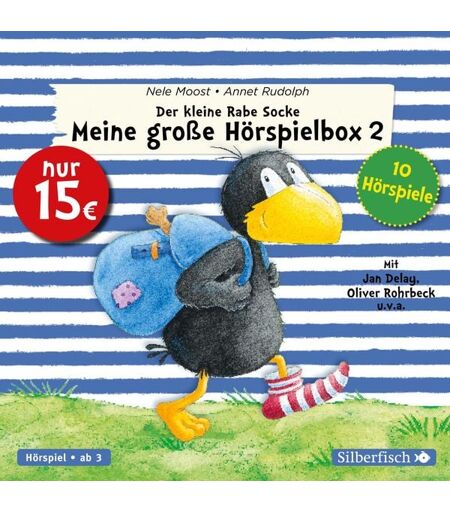 Die frechste Hörspielbox der Welt Diese dicke Box enthält zehn beliebte Geschichten vom kleinen Raben Socke. Es lesen bekannte Sprecher wie Jan Delay, Oliver Rohrbeck, Peter Kaempfe u. v. a. Und der beliebte Rabe Socke-Song vom Duo Dieter Faber und Frank Oberpichler darf natürlich auch nicht fehlen! ...