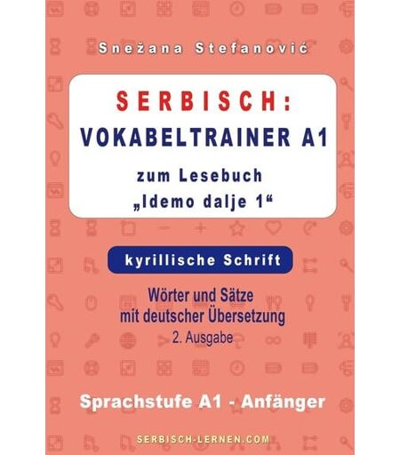 "Serbisch: Vokabeltrainer A1 zum Buch „Idemo dalje 1“ (Sprachstufe A1 – Anfänger) wurde als Ergänzung zum Lesebuch „Serbisch: Idemo dalje 1“ entwickelt. Der Vokabeltrainer beinhaltet alphabetisch geordnete Wörter, Begriffe und Ausdrücke, die auch im Lesebuch zu finden sind, und zu jedem Wort gibt es einen oder mehrere Sätze als Beispiel. Alle Wörter und Sätze sind in kyrillischer Schrift geschrieben und zu allen Wörtern und Sätzen ist eine Übersetzung ins Deutsche vorhanden. Der Vokabeltrainer kann auch unabhängig vom Rest des begleitenden Materials genutzt werden, als eigenständige Lektüre oder als Nachschlagewerk beim Serbisch Lernen. Die gleiche Version des Buches ist auch in lateinischer Schrift optional erhältlich. Dieses Buch ist Teil der SERBISCH LERNEN - Buchreihe ""IDEMO DALJE"", die neben Lehrbüchern, Lesebüchern, Hörbüchern, interaktiven E-Books, Videos und anderen Medien auch nützliche Tipps zum Erlernen der serbischen Sprache als Fremdsprache bietet. Weitere Informationen über die Buchreihe und andere Publikationen zum Erlernen der serbischen Sprache finden Sie auf unserer Homepage. " ...