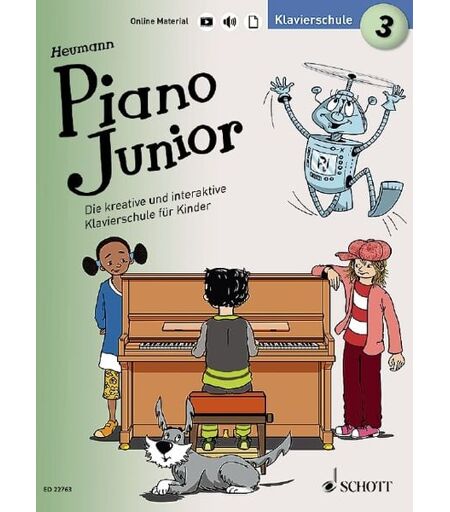 "Kindern nachhaltig Spaß am Klavier lernen vermitteln – das ist das Ziel der neuen Klavierschule Piano Junior für Kinder ab 6 Jahren von Hans-Günter Heumann! In diesem neuartigen Konzept aus insgesamt 4x4 Ausgaben begleitet der liebenswerte Roboter „PJ“ gemeinsam mit seinem Hund „Mozart“ und ihren drei Freunden die kleinen Pianisten durch die ersten Unterrichtsjahre. Freude und Spaß an der Musik stehen im Vordergrund und der Fortschritt wird schnell hörbar. Begleitende Website mit vielfältigem Zusatzmaterial: Das Besondere bei diesem Lehrwerk ist die begleitende Website als Teil der Methode: Videos zeigen den Weg zur richtigen Technik, Audioaufnahmen helfen beim Einüben der Stücke, Übungsblätter und weiteres Material bieten zusätzliche Möglichkeiten zum Vertiefen der Inhalte. Behutsamer und kindgerechter Ansatz: Die Schule schreitet in behutsamen Lernschritten voran, die mit zahlreichem Übungs- und Spielmaterial gefestigt und vertieft werden. Musikalität und Kreativität werden von Beginn an spielerisch vermittelt. Für Klavierlehrende steht auf der Website die PDF-Broschüre ""Pädagogischer Hintergrund"" mit allen Infos bereit. Umfassendes Konzept – zeitgemäß und flexibel: Zu jedem Band der Klavierschule stehen jeweils drei Begleithefte zur Verfügung mit vielfältigem Arbeitsmaterial und passenden Spielstücken für einen abwechslungsreichen Unterricht, der den unterschiedlichen Bedürfnissen der Schüler gerecht wird: • Theoriebuch 3 (ED 22773) • Duettbuch 3 (ED 22783) • Konzertbuch 3 (ED 22793) Schwierigkeitsgrad: 1-2" ...