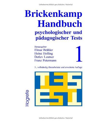 Binding : Gebundene Ausgabe, Edition : 3., vollst. überarb. und erw. A., Label : Hogrefe-Verlag, Publisher : Hogrefe-Verlag, medium : Gebundene Ausgabe, numberOfPages : 726, publicationDate : 2002-06-01, authors : Rolf Brickenkamp, publishers : Elmar Brähler, Heinz Holling, Detlev Leutner, Franz Petermann, languages : german, ISBN : 3801714403 ...