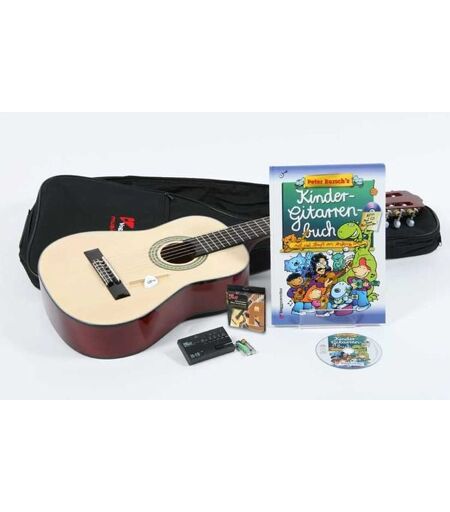 Eine ausgesuchte Qualitäts-Gitarre mit einer robusten, wasserabweisenden Tasche wird ergänzt durch Peter Bursch’s Kindergitarrenbuch. Damit können alle Kinder bereits nach wenigen Minuten das erste Lied spielen. Eine CD zum Mithören erleichtert das Lernen. Akustik-Gitare (3/4 Größe): Fichtendecke mit schwarzer Einfassung, Boden und Zargen aus Catalpa (mahagonifarbig gebeizt), Hals aus Linde, Steg aus Palisander mit seitlichen Bundmarkierungen, Neusilberbünde, verchromte Mechaniken mit perlmuttfarbenen Acrylknöpfen, Nylonsaiten. Mensur = 590 mm Halsbreite = 48 mm Gesamtlänge = 920 mm Für Kinder ab ca. 8 Jahren, aber auch für Erwachsene mit kleinen Händen! Gitarrentasche: Wir liefern die Gitarre in einer reiß- und wassergeschützten schwarzen Tasche mit Schaumstoffpolster, Reißverschuß, großem Zubehörfach und verstellbarem Rucksackgurt. Griff optimiert für kleine Hände. Peter Bursch's Kindergitarrenbuch: Spielerischer und einfacher Einstieg in das Gitarrenspiel ohne Langeweile! Mit vielen lustigen Liedern, Geschichten und Bildern. Alle Lieder und Übungen auf CD zum Mitspielen! Leichter geht's nicht - ohne Noten! (DIN A4, Hardcover, 108 Seiten, 1 CD) Plektrum: Das “Spiel-Plättchen” benötigt man alternativ zur Finger-Zupftechnik zum Anschlagen der Saiten. Es wird gerade in den Stilrichtungen Folk, Rock, Blues und Pop sehr häufig verwendet. Stimmgerät: Das elektronische Stimmgerät macht das Stimmen der Gitarre auch für Anfänger kinderleicht - inklusive Batterien und Bedienungsanleitung! ...