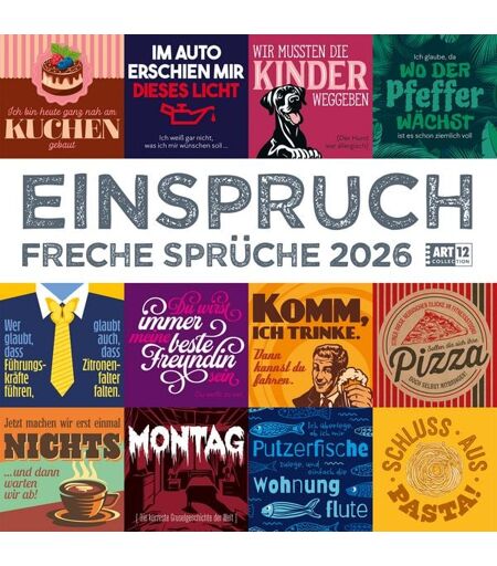 Zwölf freche und lustige Sprüche, die Sie gut durchs Jahr bringen: Fans von farbenfroher, typografischer Wanddekoration und starken Statements treffen mit diesem humorvollen Kalender garantiert die richtige Wahl. Alle Art12-Kalender sind mit einem Jahresplaner ausgestattet. • Hochwertiger Art12-Collection-Broschürenkalender • Sprüche-Kalender im schlanken Hochformat: 30x30 cm, (aufgeklappt 30x60 cm) • Kalendarium mit Platz für Notizen, inklusive Jahresplaner • Auf Papier aus nachhaltiger Forstwirtschaft in Deutschland produziert • Leistet einen Beitrag zum Ackermann Firmenwald • 4-sprachiges Kalendarium: Deutsch, Englisch, Französisch, Italienisch Wie alle Ackermann-Kalender ausschließlich in Deutschland auf Papier gedruckt, das aus vorbildlich bewirtschafteten Wäldern und anderen kontrollierten Quellen stammt. Transparente CO 2 -Kompensation in Kooperation mit unserem Klimapartner NatureOffice, bei der nachweislich Treibhausgase reduziert sowie die lokale Umwelt und die Belange der Bevölkerung gefördert werden. ...