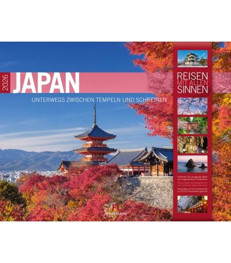 Zwischen Zen und dem Zauber der aufgehenden Sonne: Japan fasziniert mit einer spirituellen Kultur, alten Traditionen, stimmungsvollen Landschaften und einer außergewöhnlichen Architektur. Heilige Orte, Tempel und Schreine zeugen von der Wichtigkeit von Shintoismus und Buddhismus im Alltag und transportieren die Ruhe und besondere Energie der fernöstlichen Lebensart. Ein Kalender, der nicht nur an fremde Orte, sondern auch zu innerer Einkehr führt. • Einzigartige Bilder und ungewöhnliche Perspektiven aus dem Land der aufgehenden Sonne • Japan-Kalender im großen Querformat: 54x42 cm • Hochwertiger Wandkalender mit 200 g/qm Papier und Spiralbindung • Auf Papier aus nachhaltiger Forstwirtschaft in Deutschland produziert • Leistet einen Beitrag zum Ackermann Firmenwald • Deutschsprachiges Kalendarium Wie alle Ackermann-Kalender ausschließlich in Deutschland auf Papier gedruckt, das aus vorbildlich bewirtschafteten Wäldern und anderen kontrollierten Quellen stammt. Transparente CO 2 -Kompensation in Kooperation mit unserem Klimapartner NatureOffice, bei der nachweislich Treibhausgase reduziert sowie die lokale Umwelt und die Belange der Bevölkerung gefördert werden. Auch eine schöne Geschenkidee für Japan- und Asien-Fans, Kultur-Interessierte, Globetrotter:innen, Weltenbummler:innen und Reisefreudige. ...