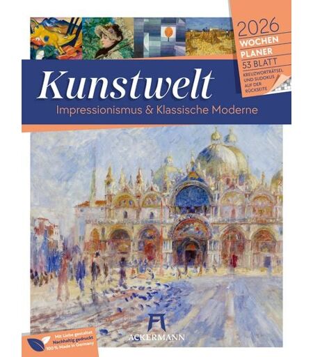 Kunst inspiriert, lädt zum Nachdenken ein und macht das Leben einfach ein Stück bunter und schöner. Wir stellen Ihnen 53 prominente Werke und Kunstschaffende aus dem 19. und 20. Jahrhundert vor und führen in die Welt von Impressionismus, Expressionismus, Kubismus & Co. ein. Ein Kalender wie ein wöchentlicher Museumsbesuch. Übersichtliches Kalendarium mit Platz für Ihre Einträge und dazu jede Woche neuer Rätselspaß: Kreuzworträtsel und Sudokus auf allen Rückseiten. • Wochenkalender mit 53 Gemälden namhafter Künstler aus dem 19. und 20. Jahrhundert • Kunst-Kalender im Hochformat: 25x33 cm • Mit übersichtlichem Eintragekalendarium sowie Kreuzworträtseln und Sudokus auf jeder Rückseite • Auf Papier aus nachhaltiger Forstwirtschaft in Deutschland produziert, mit Spiralbindung • Leistet einen Beitrag zum Ackermann Firmenwald • Deutschsprachiges Kalendarium Wie alle Ackermann-Kalender ausschließlich in Deutschland auf Papier gedruckt, das aus vorbildlich bewirtschafteten Wäldern und anderen kontrollierten Quellen stammt. Transparente CO 2 -Kompensation in Kooperation mit unserem Klimapartner NatureOffice, bei der nachweislich Treibhausgase reduziert sowie die lokale Umwelt und die Belange der Bevölkerung gefördert werden. Auch eine schöne Geschenkidee für Kunst-Interessierte, Bewunder:innen der klassischen Moderne, des Impressionismus wie des Expressionismus, und natürlich für alle, die Spaß an Rätseln und Sudoku haben. ...