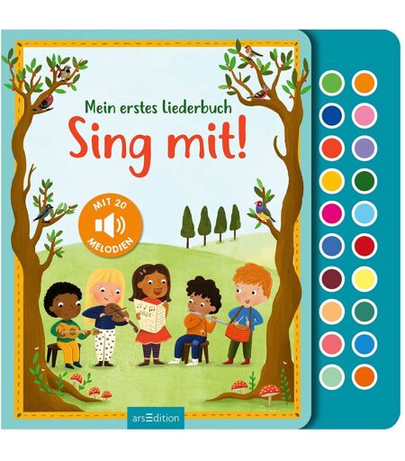 Mit dem Buch "Sing mit! Mein erstes Liederbuch" aus dem Verlag arsEdition lernen Minis ab 12 Monaten 20 verschiedene Kinderlieder kennen. Die Kleinen können den Melodien lauschen und selber mitsingen. ab 12 Monaten geeignet Soundbuch mit Sound-Elementen, Notensätzen und Liedtexten, An- und Ausschalter, auswechselbare Batterien 22 Seiten deutschsprachig Das Liederbuch "Sing mit! Mein erstes Liederbuch" aus dem Verlag arsEdition enthält die Texte und Notensätze von 20 beliebten Kinderliedern. Für besonderen Spaß sorgen integrierte Sound-Elemente. Sie lassen sich durch leichten Druck auf die bunten Punkte aktivieren und lösen das Abspielen der verschiedenen Melodien aus. So gestaltet sich das gemeinsame Musizieren besonders einfach. Die Beschäftigung mit dem Buch fördert spielerisch die Motorik, Rhythmik und Lautbildung der Kids. Sie spricht den Hörsinn der Kleinen an, stimuliert beide Gehirnhälften und animiert zur Bewegung. Praktisch: Bei Bedarf kann der Ton komplett ausgeschaltet werden. Die Batterien sind auswechselbar. ...