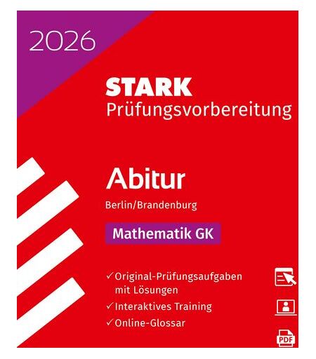 Mathematik GK – Abitur 2026 Berlin – Prüfungsvorbereitung Der optimale Band für die Vorbereitung auf die Abiturprüfung im Fach Mathematik (Grundkurs) am Gymnasium in Berlin und in Brandenburg . Das gedruckte Buch enthält: Original-Abituraufgaben (Grundkurs) 2021 bis 2024 – für eine realitätsnahe Prüfungssimulation. Ausführliche Lösungen zu allen Aufgaben – ideal zur Selbstkontrolle. Hilfreiche Tipps zum Lösungsansatz – Schritt für Schritt zur richtigen Lösung. Nützliche Hinweise zu Ablauf und Anforderungen der Prüfung – so kann Sie nichts mehr überraschen. Zusätzliche Unterstützung erhalten Sie exklusiv auf der Plattform MySTARK : die Original-Prüfung 2025 mit ausführlichen Lösungen – dank aller Lösungsschritte bleiben keine Fragen offen. Online-Prüfungstraining – der einzigartige digitale Lernbaustein von STARK! Das Online-Prüfungstraining bietet: Interaktives Lernen mit dem PC/Laptop/Tablet – flexibel und nach eigenem Tempo. Zahlreiche interaktive Übungsaufgaben zu den Basiskompetenzen der Abschlussprüfung – zum gezielten Trainieren der prüfungsrelevanten Themen. Sofortige Auswertung & individuelles Feedback – für effizientes Üben. Das Besondere am interaktiven Training: Jede Aufgabe liegt nicht nur einmal, sondern in zahlreichen Varianten vor, sodass sich die Trainingsmöglichkeiten vervielfachen. Hinweis: Alle Inhalte auf der Plattform MySTARK stehen bis zum 31.12.2026 zur Verfügung. ➔ Mit dem umfassenden Vorbereitungsband zum Prüfungserfolg – jetzt den roten Klassiker bestellen. ...