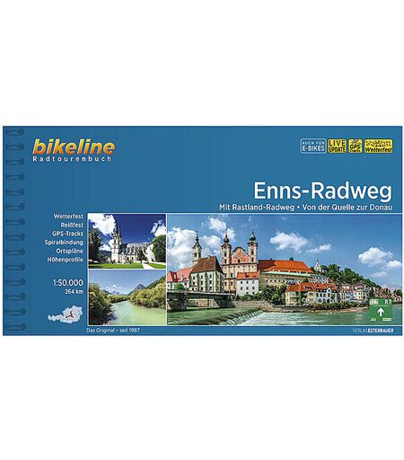 Der Enns-Radweg erstreckt sich vom salzburgischen Pongau über Schladming, den Nationalpark Gesäuse und den Naturpark Eisenwurzen nach Oberösterreich mit dem Nationalpark Kalkalpen hinauf zur schönen blauen Donau. Diese Routenführung verspricht eine Fahrt durch ein einzigartiges Alpenpanorama, atemberaubende Naturlandschaften zwischen Dachstein und Niederen Tauern, dem Gesäuse und dem einsamen Reichraminger Hintergebirge … eine Radtour voller Überraschungen und ein Geheimtipp für jeden begeisterten Radurlauber! Details: Land: Österreich Region: Oberösterreich,Steiermark Fernweg: Enns-Radweg Regionalweg: Rastlandradweg Produktcode: ENNS Format: 220x120 mm Bindung: Spiralbindung Schutz: wetterfest Sonstiges: Übernachtungsverzeichnis, Höhenprofile Lieferinfo: lieferbar, erschienen 03/2022 Gesamtlänge: 264 km Anzahl der Karten: 50 Anzahl der Ortspläne: 5 Höhenmeter auf: 1328 m Höhenmeter ab: 2148 m Anteil Radweg: 32 % Anteil Unbefestigt: 6 % Anteil Verkehr: 19 % ...