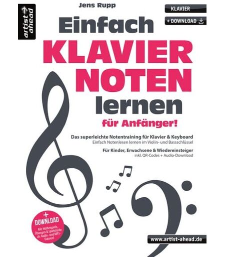 "• Noten lernen leicht gemacht • Behutsam, gründlich & effektiv • Motivation & Freude beim Üben & Spielen • Schnelle Fortschritte • Mit Übungen, Aufgaben & Lösungen • inkl. QR-Codes & Audio-Download Mit ""Einfach Klaviernoten lernen für Anfänger"" präsentiert Jens Rupp eine Notenschule, die sich an Kinder ab 8 Jahren, Erwachsene und Wiedereinsteiger richtet. Sie stellt eine wertvolle Ergänzung zu gängigen Klavierschulen dar und ermöglicht einen superleichten Einstieg in die Welt der Klaviernoten und die Kunst des Notenlesens. Zu Beginn fällt es vielen Lernenden schwer, Noten zu lesen, da mit Tasteninstrumenten in zwei verschiedenen ""Notenschlüsseln"" gespielt wird. Um die Noten des Violin- und des Bassschlüssels ""gleichzeitig"" zu erlernen, braucht es Zeit, Geduld und Übung. Aus diesem Grund ist es wichtig, sich immer wieder bewusst mit den Noten zu befassen und sie mit Hilfe dieser Notenschule motiviert und mit Freude kennenzulernen. ""Einfach Klaviernoten lernen für Anfänger"" besteht aus drei Teilen. Im ersten Teil wird ausschließlich der Violinschlüssel behandelt und die Noten vom eingestrichenen c' bis zum dreigestrichenen c''' sowie das kleine h werden vorgestellt und eingeübt. Sobald Du das Notenlesen im Violinschlüssel beherrschst, ist es relativ leicht die Noten des Bassschlüssels zu erlernen, denn diese sind im Verhältnis zum Violinschlüssel lediglich um zwei Noten nach oben verschoben. Im zweiten Teil dieser Notenschule wird der Bassschlüssel vorgestellt und die Noten vom großen C bis zum eingestrichenen c' eingeführt. Im dritten und letzten Teil werden schließlich die Noten des Violin- und Bassschlüssels im üblichen Notensystem für Tasteninstrumente (Doppelsystem) vorgestellt, wodurch deine Fähigkeit des Notenlesens weiter vertieft und optimiert wird. In ""Einfach Klaviernoten lernen für Anfänger"" werden die Noten nicht nur erlernt und gespielt, sondern beschriftet und selbstständig eingetragen. Die Lösungen zu den enthaltenen Übungsaufgaben findest Du im hinteren Teil des Heftes. ""Einfach Klaviernoten lernen für Anfänger"" – der praktische Helfer und perfekte Wegbegleiter auf deiner musikalischen Reise am Klavier & Keyboard. QR-Codes, Download-Material & Audio-CD Scanne die im Buch enthaltenen QR-Codes mit dem Smartphone oder Tablet und gelange direkt zu den Hörbeispielen. Unter artist-ahead-download.de stehen die Hörbeispiele, Übungen und Spielstücke als Audio- und MP3-Dateien zum kostenlosen Download zur Verfügung. Eine Audio-CD mit allen Titeln zu diesem Buch ist in unserem Onlineshop unter artist-ahead.de erhältlich." ...