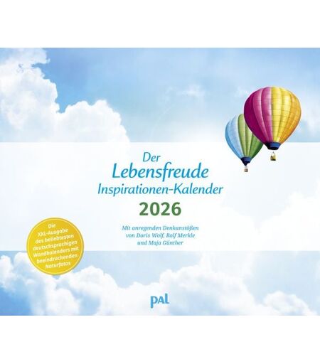Lass dich von der Lebensfreude durch das Jahr tragen! Aufbauend, stärkend, positiv: Der Inspirationen-Wandkalender zum original Lebensfreude-Kalender ist ein Muss für alle Fans! Mit seinen motivierenden Ratschlägen, einfühlsamen Lebensweisheiten und den beeindruckenden stimmungsvollen Landschaftsfotografien lenkt er auf jedem Kalenderblatt den Blick auf das, was im Leben wichtig und schön ist. Ein plakatives und stilvolles Einrichtungsaccesoire, ein aufbauender Begleiter und zu einer Quelle der Inspiration! Inspiration im Großformat: Wandkalender 2026 XXL mit Natur-Motiven und praktischen, psychologisch fundierten Ratschlägen für ein gutes Leben Der atmosphärische Fotokalender zum erfolgreichen PAL-Lebensfreude-Kalender. 12 Kalenderblätter im Format 55 x 46 cm Positive Gedanken, Impulse und Denkanstöße und Expertenrat von Doris Wolf, Rolf Merkle und Maja Günther Die Alles-wird-gut-Kalender von PAL: sinnerfüllte und wohltuende Geschenke für liebe Menschen! Der Lebensfreude-Kalender: motivierende Sprüche und liebevolle Anregungen Seit vielen Jahren ist er der beliebteste Kalender Deutschlands: Über 5 Millionen Exemplare des Lebensfreude-Kalenders wurden bereits verkauft. Mehr als 350.000 Kalender-Fans freuen sich jedes Jahr auf inspirierende Denkanstöße und praktische Lebenshilfe von den Psychotherapeuten und Bestsellerautoren Dr. Doris Wolf, Dr. Rolf Merkle und Maja Günther. ...