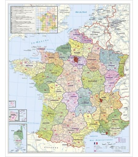 Wandkarte / Poster - beschreib- und abwischbar - extrem reißfest - Verwaltungsgliederung in Regionen, Departements und Bezirke - Straßenverkehrsverbindungen, Eisenbahnlinien, Kanäle, Flughäfen - Kennzeichnung der regionalen Hauptstädte - Postleitzahlen für jeden aufgeführten Ort - Beschriftung in französischer Sprache ...