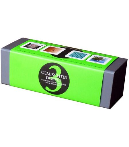 Bühne frei für Folge drei! Das Gemischte Doppel, das bekannte Memospiel mit den verrückten Buchstabendrehern, geht in die nächste Runde. Das bedeutet 36 neue Wortpaare für die Freunde der kürzesten Kolumne der Welt. Diesmal findet der Quarkzopf zum Quarzkopf, die Wurmstelle zur Sturmwelle oder das Stuhlbein zum Buhlstein. Die Sprachdiamanten aus dem Magazin der Süddeutschen Zeitung sind wie gewohnt sorgfältig geschliffen und brillant bebildert. Nach dem schwarzen Karton der Folge 1 und dem weißen Karton der Folge 2 erscheint das Gemischte Doppel 3 in edlem Grau. Grauer Karton und fünf Neontöne: Wie gewohnt gibt es das Konversations- und Gedächtnisspiel in fünf verschiedenen Banderolen-Farben bei fünfmal gleichem Inhalt. Welche Farbe der Besteller im Onlineshop erhält, entscheidet der Zufall, im Laden kann man sich seine Lieblingsfarbe aussuchen. Weiterhin gilt es, verdrehte Wort-Bild-Paare zusammenzufügen, die sich auf den Bildern nur ein bisschen ähnlich sehen, etwa Wunderkinder - Winderkunder und Geschenkladen - Gelenkschaden. ...