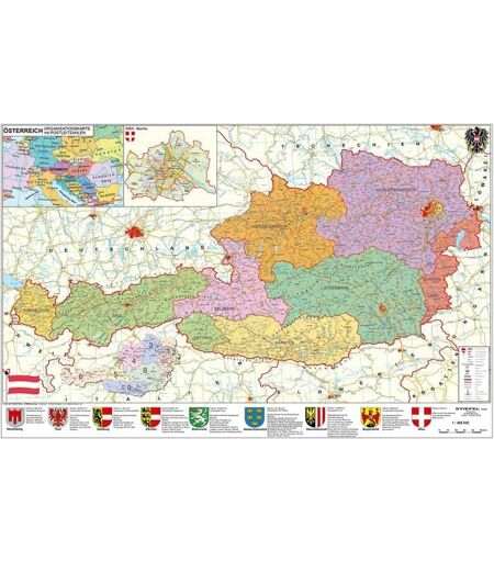 Wandkarte mit Metallbeleistung - beschreib- und abwischbar - extrem reißfest - Inselkarte Österreich politisch mit PLZ für jeden angegebenen Ort - Bundeslandgrenzen und Verwaltungsgliederungen bis Bezirksebene - Landes- und Bezirkshauptstädte gekennzeichnet - Ortsangaben ab 2.000 Einwohner - Flüsse und Gewässer - Autobahnen mit Nr., Bundesstraßen, Bahnlinien, internationale Flughäfen - Gebirgszüge mit Namen und Gebirgspässe mit Höhenangaben - Gipfel mit Höhenangaben ab 2.000 Meter (Seehöhe) - Wappen mit Angaben der Bundeslandgröße und Nennung der Bundeslandbezirke - Beikarte Wien-Bezirke - Beikarte Postleitbezirke - Beikarte Österreich und seine Nachbarländer ...
