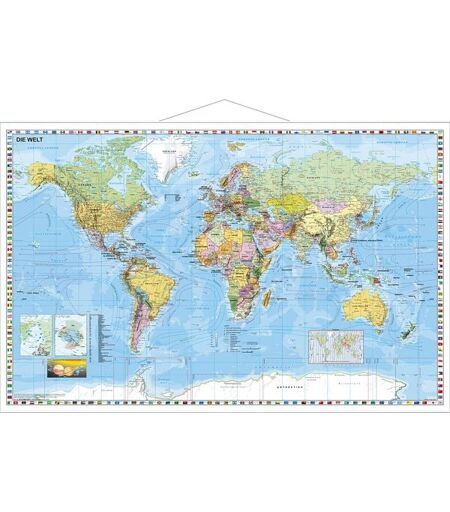 Wandkarte mit Metallbeleistung - beschreib- und abwischbar – extrem reißfest - politische Weltkarte mit Gebirgsrelief und einem sehr hohen Informationsgehalt - Hauptstädte und wichtige Städte - mit Flaggen aller Staaten der Erde - bedeutende Seehäfen - internationale Flughäfen - Angabe der Meerestiefen - warme und kalte Meeresströmungen - Zeitzonen der Erde und Kontinente - gesonderte Darstellung der Polregionen - Planeten unseres Sonnensystems ...