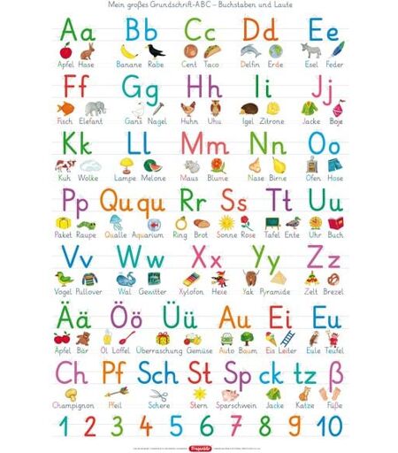 Bitte beachten! In den Bundesländern werden 4 unterschiedliche Schulschriften eingesetzt. Wir bieten Poster in der Schulausgangsschrift und in der Grundschrift an. Bitte informieren Sie sich vor dem Kauf, mit welcher Schrift in Ihrer Schule gearbeitet wird. • Richtungspfeile erleichtern das Schreiben der Einzelbuchstaben • Lernwörter unterstützen das erste Lesen und Schreiben • Dieses Poster beinhaltet zusätzlich zu den Buchstaben die gängigsten Laute Das farbenfroh und anschaulich illustrierte Übungsposter ist die ideale Ergänzung der mehrfach ausgezeichneten Fragenbär-Programme. Für noch mehr Lernspaß! Gedruckt auf stabilem 170g Papier, folienkaschiert, abwischbar ...