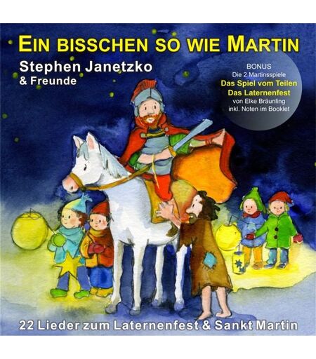 "Empfohlen für Hörer von 2 bis 8 Jahren. Neue und alte, stimmungsvoll arrangierte Martins- und Laternenlieder von und mit Stephen Janetzko mit Texten von Elke Bräunling, Erwin Grosche, Rolf Krenzer u.a. Mit dem bekannten Titellied ""Ein bisschen so wie Martin"" (Text: Elke Bräunling - Musik: Paul G. Walter - Verlag: Edition Seebär-Musik Stephen Janetzko). Inkl. der beiden Martinsspiele „Das Spiel vom Teilen“ und „Das Laternenfest“ von Elke Bräunling (im Booklet). Mit weiteren Songbeiträgen von Kati Breuer, Taato Gomez, Hermann Heimeier, Ottmar Liedl (Kinderclown OLi) und Heiner Rusche. Alle Lieder der CD: 1. Ein bisschen so wie Martin - Stephen Janetzko 3:40 2. Sankt Martin ritt durch Schnee und Wind - Stephen Janetzko 3:09 3. Ich schenk dir einen Stern (Sternenkinder-Lied) - Stephen Janetzko 3:04 4. Teilen, Teilen - Stephen Janetzko 1:04 5. Martin, lieber Martin - wir wollen sein wie du - Stephen Janetzko 2:50 6. Teilen wie St. Martin (Sonne, Mond und Sterne) - Stephen Janetzko 2:14 7. Laterne, Laterne, Sonne, Mond und Sterne (1) - Stephen Janetzko 0:16 8. Heute ist St. Martinstag - Stephen Janetzko 2:29 9. Laterne, Laterne, komm leuchte für mich - Stephen Janetzko 4:09 10. Wenn wir mit den Laternen gehn (Lied zum Laternenfest) - Stephen Janetzko 1:57 11. Laterne, Laterne, Sonne, Mond und Sterne (2) - Stephen Janetzko 0:16 12. Laternenlicht, Laternenlicht - Stephen Janetzko 2:28 13. Eine Laterne basteln wir - Heiner Rusche 3:02 14. Laternen leuchten hell - Stephen Janetzko 3:57 15. Laterne, Laterne, Sonne, Mond und Sterne (3) - Stephen Janetzko 0:15 16. Brenn, Laterne - Stephen Janetzko 3:46 17. Das Licht geht auf die Reise - Kati Breuer 2:48 18. Laterne, Laterne, Sonne, Mond und Sterne (4) - Stephen Janetzko 0:16 19. Martins Mantel - Stephen Janetzko 1:51 20. Sankt Martin ist da - Stephen Janetzko 1:49 21. Wir tragen die Laternen, so bunt - Hermann Heimeier 2:42 22. Ich geh mit meiner Laterne - Stephen Janetzko 3:38 23. Laterne, Laterne, Sonne, Mond und Sterne (5) - Stephen Janetzko 0:16 24. Sankt Martin - Ottmar Liedl (Kinderclown Oli) 4:47 25. Dreh dich, Laterne (Laternentanz) - Stephen Janetzko 2:30 26. Wie Martin - Taato Gomez & Stephen Janetzko 4:20 27. Laterne, Laterne, Sonne, Mond und Sterne - Stephen Janetzko 2:14 Gesamtspielzeit ca. 66:03 min." ...