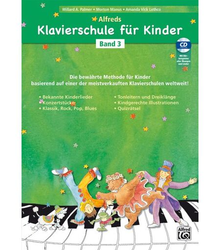 Alfreds Klavierschule für Kinder ist die deutschsprachige Ausgabe des weltweit erfolgreichen All-In-One Course der ALFRED BASIC PIANO LIBRARY. Seit Jahrzehnten international erprobt gehört sie zu den meistverkauften Klavierschulen der Welt! Die bewährte Methode für junge Einsteiger, die den Anforderungen des deutschsprachigen Marktes entsprechend adaptiert worden ist, ist in drei aufeinander aufbauenden Bänden plus Spielbuch erhältlich. Schritt für Schritt lernen Kinder ab 5–6 Jahren das Klavierspiel und werden behutsam an das Notenlesen herangeführt. Übungsstücke, Spielmaterial und Vortragsstücke wie auch musik-theoretische Aspekte mit Aufgaben und Quizspielen ergeben sich logisch aus den Spielstücken. Den Kindern geläufige, populäre englischsprachige Songs wurden mit deutschen Texten versehen oder durch beliebte, deutschsprachige Kinderlieder ersetzt. Die beiliegende CD enthält alle Übungen und Spielstücke. Kindgerechte Vierfarbillustrationen, ein ansprechendes Layout und eine Urkunde zum krönenden Abschluss runden das Gesamtkonzept ab. Die Lösungsseiten der Quizaufgaben sowie Hörbeispiele im Audioformat sind online auf klavier-fuer-kinder.de abrufbar. Der Band 3 setzt das Konzept der ersten beiden Bände konsequent fort und bietet interessante neue Spielstücke zur Erweiterung des Klavierrepertoires: Einführung neuer melodischer und harmonischer Intervalle; Neue Daumen- und Fingerlagen; Ottava- (8va) und Ottava bassa (8vb); Auflösungszeichen; Vorzeichen am Zeilenanfang; Punktierte Noten; Lagenwechsel; Fingerübersatz; Daumenuntersatz; Tonleitern und Dreiklänge; Erweiterung von Dynamik- und Artikulationstechniken. Die bekannten Kinderlieder, die Konzertstücke aus Klassik, Rock, Pop, Blues und die unter klavierpädagogischen Aspekten ausgewählten Übungsstücke fördern die Musikalität und halten die Motivation der Klavierschüler aufrecht. ...