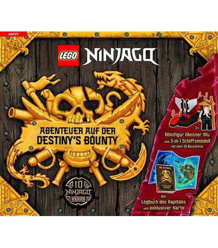 "Von mutigen Ninja und grimmigen Piraten - Fan-Box mit LEGO® Modell, 50 LEGO® Steine und Minifigur ""Meister Wu"" - Mit spannendem Logbuch und Karte Ahoi Ninja-Fans! Es wird Zeit, in See zu stechen und das 10-jährige Jubiläum von LEGO® Ninjago mit dieser Box über das coolste Fortbewegungsmittel der Ninja zu feiern. In der Box finden Fans ein liebevoll handillustriertes Logbuch, in dem alle Kapitäne des bekannten Ninja-Flugseglers Destiny’s Bounty ihre Abenteuer mit dem Schiff aufgeschrieben haben. Denn die Destiny’s Bounty befand sich nicht immer im Besitz der Ninja. Ursprünglich gehörte sie Kapitän Soto, der mit seiner Piratencrew lange Zeit das Endlose Meer unsicher machte. Auch Fieslinge wie Nadakhan und Garmadon bemächtigten sich zeitweise des Schiffs. Sie alle berichten von ihren gefährlichen aber auch aufregenden Missionen und lassen Fans in Erinnerungen schwelgen. Besondere Highlights sind die ebenfalls enthaltene Minifigur „Meister Wu“ sowie 50 LEGO® Steine, aus denen Fans drei coole Modelle der Destiny’s Bounty bauen können. Begeistern wird sie außerdem die beiliegende Karte, auf der die wichtigsten Orte der Abenteuer verzeichnet sind. Somit bietet die Box für alle LEGO Ninjago Fans ab 6 Jahren den ultimativen Bau-, Spiel- und Lesespaß. LEGO, the LEGO logo, the Brick and Knob configurations, the Minifigure and NINJAGO are trademarks of the LEGO Group. ©2021 The LEGO Group. Manufactured by AMEET Sp. z o.o. under license from the LEGO Group" ...
