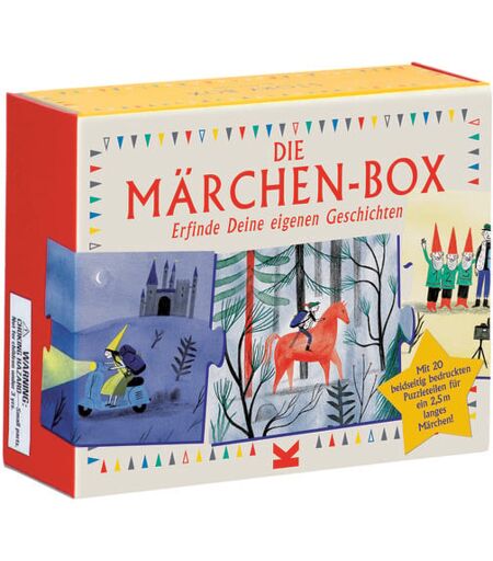 Die Märchen-Box Mit dieser wunderbaren Box kannst du eigene Märchen erfinden. Es enthält 20 beidseitig bedruckte Puzzleteile, die verschieden kombiniert werden können. So lassen sich zahlreiche Geschichten erfinden, mit alternativen Schlussvarianten! Kannst du die Elfe retten, bevor sie vom Wolf gefressen wird? Bietet dir die Hexe einen vergifteten Apfel an, oder wird sie dir helfen, das riesige rosa Kaninchen schrumpfen zu lassen, das dein Schloss bedroht? ...