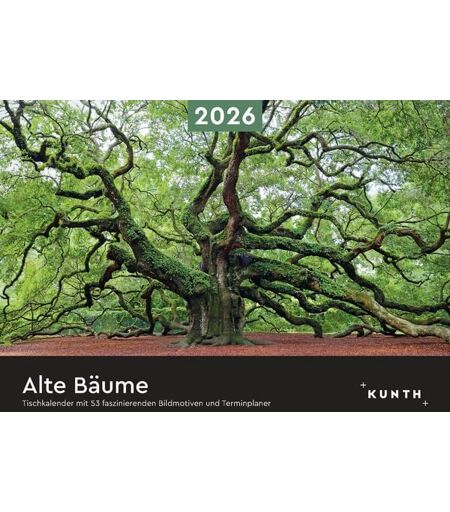 Dieser KUNTH Tischkalender „Alte Bäume“ 2026 führt zu 53 traumhaften Zielen in Bild und Text. Wöchentlich gibt es Neues zu entdecken, und der Terminplaner erleichtert die Organisation des Alltags. Wenn Bäume Geschichten erzählen könnten, wäre die Welt um zahlreiche Erkenntnisse reicher. Ob moosbewachsene Stämme im dunklen Auenwald oder von Wind und Wetter geformte Pinien an karstigen Küsten – alte Bäume erzählen durch ihr Aussehen von ihrem langen Leben. Wer die fantastischen Bilder genau betrachtet, kann ihnen zuhören. + jeden Monat brillante, farbstarke, kontrastreiche Fotografien + wöchentlicher Tageskalender mit Stundeneinteilung + stabiler Aufsteller mit wattiertem Umschlag, hochwertiger Druck ...