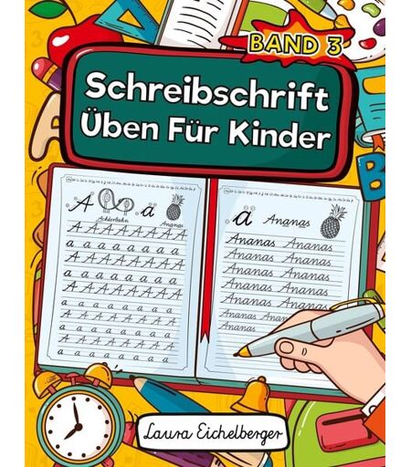"Ihr Kind ist bereit, das Schreiben in Schreibschrift zu lernen, und Sie möchten es bestmöglich dabei unterstützen? Dann ist ""Schreibschrift Üben Für Kinder - Band 3"" genau das Richtige für Sie!Das Schreiben ist eine der wichtigsten Fähigkeiten, die Kinder im Grundschulalter erwerben. Begonnen wird meist mit der klassischen Druckschrift, später folgt dann die Schreibschrift. Letztere stellt für viele Kinder eine besondere Herausforderung dar. Schließlich erfordert die Umstellung ein Umdenken und gerade Schüler, die sich mit der Feinmotorik schwer tun, kommen an ihre Grenzen.""Schreibschrift Üben Für Kinder - Band 3"" hilft dabei, diese Grenzen auf altersgerechte Weise zu durchbrechen, und bringt Schülern die Schreibschrift Schritt für Schritt näher. Auf übersichtlich strukturierten Seiten führt das Übungsheft von Aa bis Zz durch alle Buchstaben des Alphabets. Der Lernprozess wird dabei folgendermaßen angeleitet:Phase 1Im ersten Schritt soll der jeweilige Buchstabe lediglich nachgefahren werden. Praktische Pfeile zeigen Ihrem Kind die richtige Schwungrichtung, sodass Missverständnisse quasi ausgeschlossen sind und gewährleistet ist, dass Ihr Kind sich das Schreiben der Buchstaben von vornherein korrekt aneignet.Phase 2Anschließend wird Ihr Kind dazu angeregt, den gerade kennengelernten Buchstaben frei und selbstständig zu schreiben. Hilfslinien unterstützen es dabei, die passende Höhe einzuschätzen.Phase 3Zu guter Letzt lädt eine separate Seite dazu ein, sich an einem ganzen Wort, das selbstverständlich den jeweiligen Buchstaben enthält, zu versuchen. So lernt Ihr Kind, wie die Buchstaben miteinander zu verbinden sind.Liebevoll gestaltete, kindgerechte Illustrationen, die zu den erlernten Worten passen, verbildlichen das Geschriebene und können natürlich auch ausgemalt werden. Die gleichbleibende Struktur des Heftes erleichtert Ihrem Kind den Lernprozess. Es wird zunehmend sicherer und kann immer wieder Fortschritte und Erfolge erleben. Durch die regelmäßige Übung schult es zudem seine Konzentration, seine Feinmotorik und seine Augen-Hand-Koordination.Das Wichtigste auf einen BlickGeeignet für Kinder im GrundschulalterVermittelt die Buchstaben von Aa bis Zz in SchreibschriftLehrt das Schreiben ganzer Worte in SchreibschriftSinnvoll strukturiert und liebevoll gestaltetFördert die Konzentration, die Feinmotorik und die Augen-Hand-KoordinationKann als Selbstlernheft oder begleitend zum Lernen der Schreibschrift in der Schule eingesetzt werdenMit ""Schreibschrift Üben Für Kinder - Band 3"" kann Ihr Kind seine Fähigkeiten in seinem eigenen Tempo erweitern und erfahren, wie motivierend das Lernen sein kann!" ...