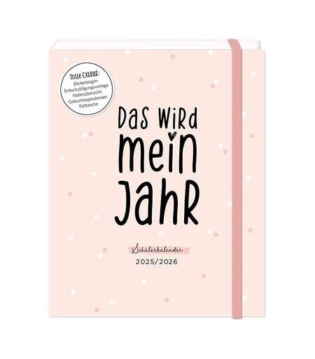 "Ein großer Schülerkalender für das Schuljahr 2025/2026 Dieser Schülerkalender ist ein absolutes Multitalent und verzaubert mit seinen vielen Extras Schüler und Schülerinnen. Jede Kalenderwoche wird übersichtlich auf einer Doppelseite dargestellt und das breite Verschlussgummi hält Zettel, Quittungen und Notizen immer fest zusammen. Durch Monatsübersichten zum Eintragen von Klausuren und Referaten lässt sich das Schuljahr 2025/2026 ganz einfach und übersichtlich Monat für Monat planen. Neben einem extra Stickerbogen gibt es auch jeden Monat tolle Mitmach-Seiten zum Rätseln, Ausfüllen oder Ausmalen. Weitere tolle Extras sind ein Geburtstagskalender, Entschuldigungsvorlagen, Notenübsichten oder ein Stundenplan. • Großer Schülerkalender mit hochwertiger Fadenheftung, Hardcover-Umschlag, Satin-Lesezeichen und Falttasche (Format: 17 x 21,5 cm) • 200 Seiten + Stickerbogen bieten jede Menge Platz für Termine, Notizen und alles andere ""Merk-Würdige"" • Tolle Extras wie ein Stundenplan, Notenübersichten, Entschuldigungsvorlagen oder ein Geburtstagskalender sorgen für gute Laune • Schulferien (für D und A) und Feiertage (für D, A und CH) sind eingetragen " ...