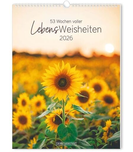 Lebensweisheiten 2026 - Großformatiger Wochenkalender mit 52 Best-of-Motiven Ein Jahr voller Glück, Gelassenheit, Liebe und Hoffnung: Dieser Wandkalender mit den schönsten Lebensweisheiten vieler verschiedener Denker, Philosophen und Autoren inspiriert dich jede Woche neu. Die 52 Aphorismen sind mit ausgewählten Fotografien kombiniert und versprühen wochenweise pure Poesie. Jede Kalenderwoche ist übersichtlich auf einer Seite dargestellt. • Großformatiger Wochenkalender zum Aufhängen (24 x 32 cm) • Zauberhafte Fotografien kombiniert mit inspirierenden Sprüchen • Praktische Spirale für ein einfaches Umblättern • Schöne Geschenkidee für die Mama, Oma, Kollegin oder beste Freundin ...