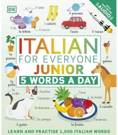 Help your child master Italian vocabulary - five words at a time! Learn 1000 Italian words over a year with this Italian workbook for beginners! It's an essential vocabulary builder for young children who are starting to learn their first Italian words. Discover the perfect introduction to Italian for children aged 6-9. It's the ultimate Italian lesson book for kids! It includes: - Beautifully illustrated scenes that teach and test five words at a time. New vocabulary is practised again at the end of each week in two pages of exercises - Clever flaps on the jacket that cover the scene so your child can practise what they have just learned - Uses the effective rote-learning method to teach new vocabulary - Teaches a range of nouns and verbs that are useful in everyday life; audio is available online and via a handy app to help with pronunciation Learning a foreign language is one of the best ways to develop your child's cognitive and language abilities. What's more, children gain insight into other cultures and their linguistic nuances. This language book covers Italian vocabulary, Italian pronunciation and makes learning the first Italian words easy and fun. Illustrations, exciting scenes, and audio recordings allow your child to immerse themselves in their Italian language-learning journey fully! Italian Everyone Junior 5 Words a Day encourages children to copy the nouns and verbs related to each scene in the book, to test their knowledge by covering the words with jacket flaps, and learn one new Italian word every day. The colourful, clear and comprehensive 5 Words a Day series from DK lays the foundations for your child's journey in learning a foreign language, at school or home. Look out for other workbooks in the series! Help your child learn, practise and understand 1000 French words in French for Everyone Junior: 5 Words a Day. ...